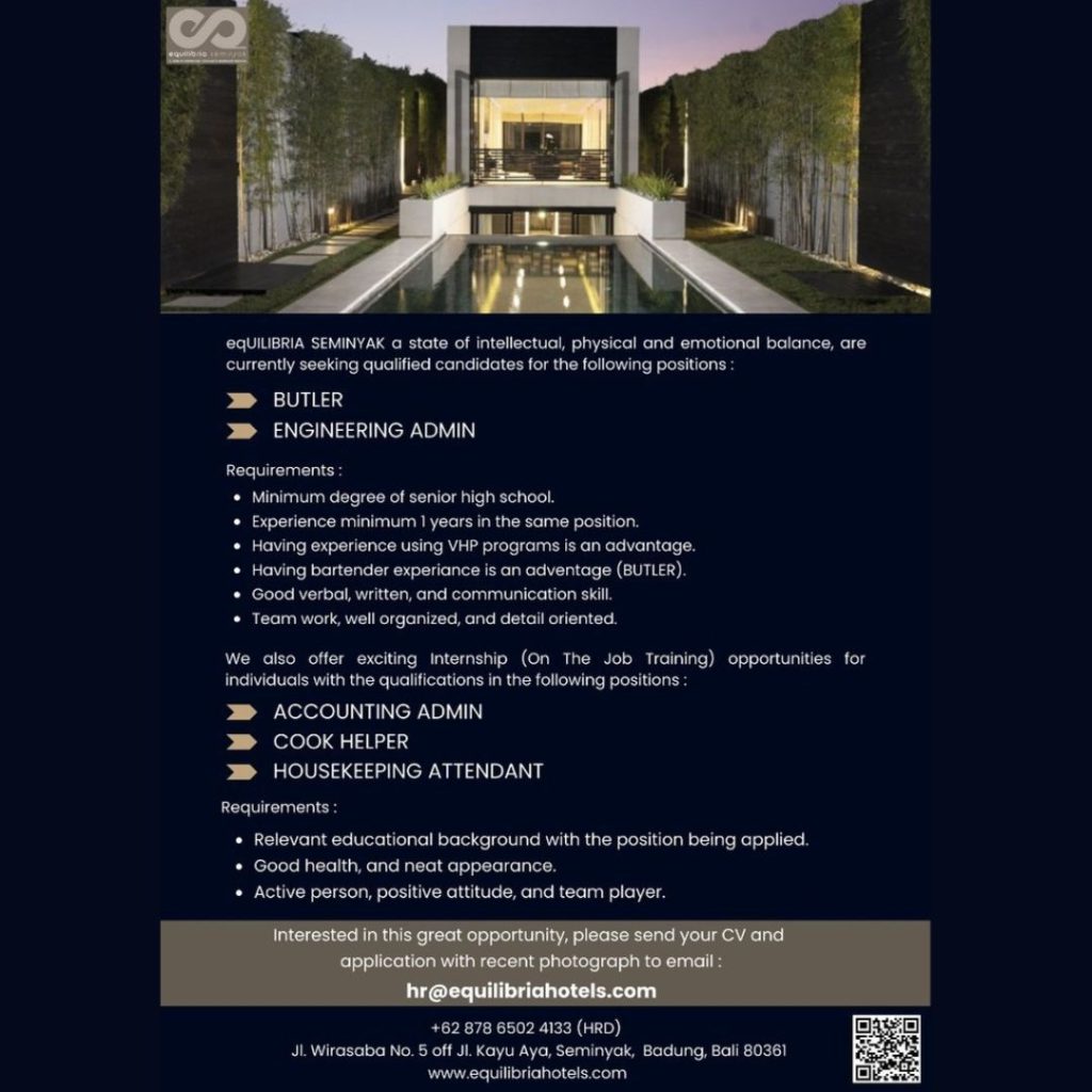 eqUILIBRIA SEMINYAK a state of intellectual, physical and emotional balance, are currently seeking qualified candidates for the following positions