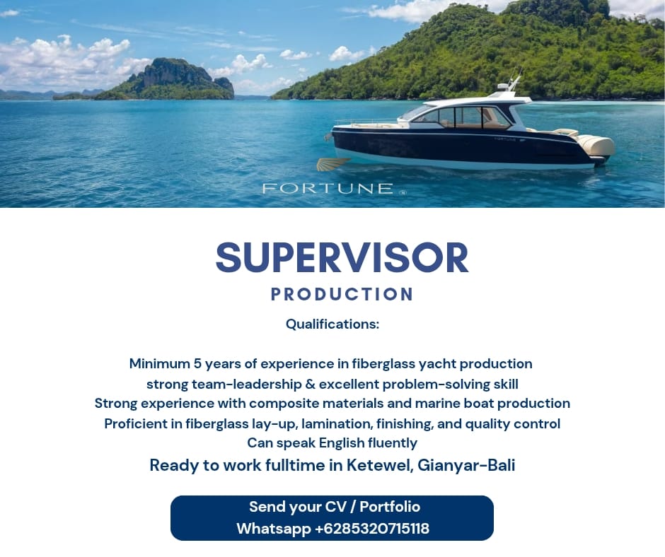 PT Fortune Yachts Bali – Indonesia’s premier yacht manufacturer with 15+ years of international boatbuilding experience – is looking for a Supervisor Production to join our growing team in Gianyar, Bali 🌊✨