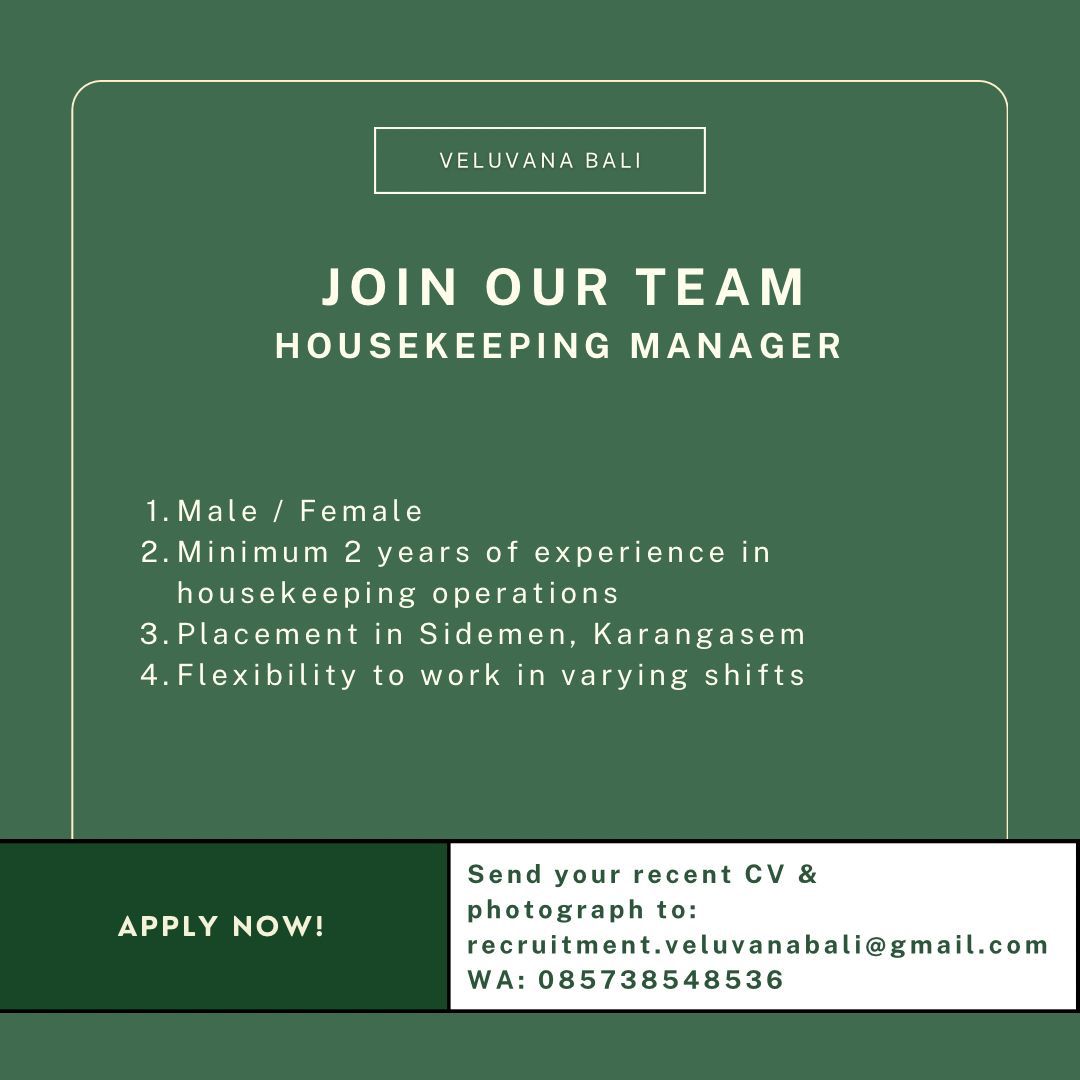 Veluvana Bali (@veluvanabali) is looking for a talented candidate to join our team as Housekeeping Manager