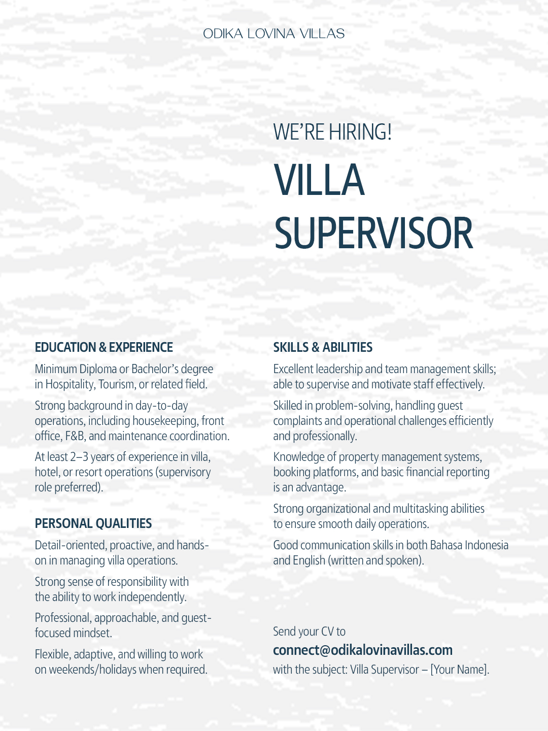 We are looking for an energetic, enthusiastic and a motivated talents for the position of Villa Supervisor with the qualification below: